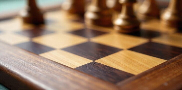 Overhead view of a meticulously arranged chessboard, representing strategic decision making in business. An overhead, top down view of a classic wooden chessboard with polished, dark and light pieces.