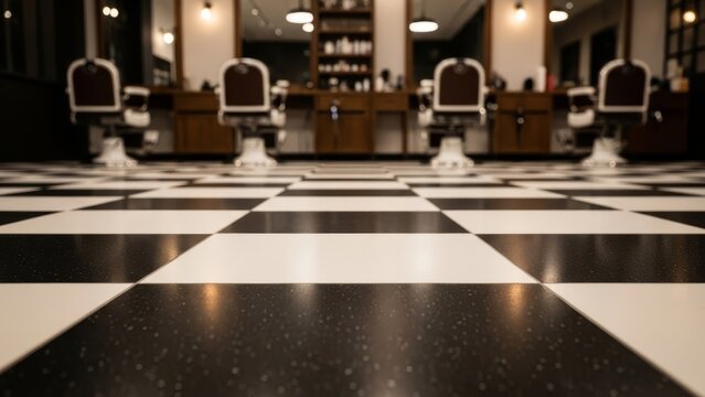 Low angle interior barbershop focusing on classic checkerboard floor pattern