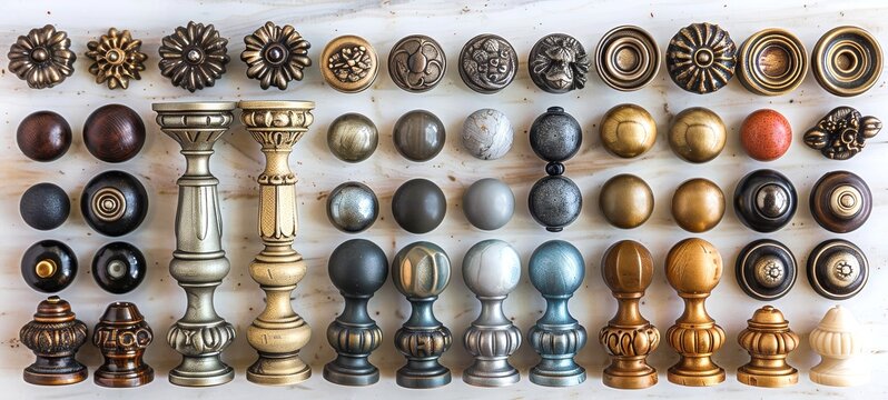 Variety of furniture handles, from floral to classic shapes. Assorted metal knobs and pulls for customization. Concept of luxury home furnishings, cabinet detailing, and decorative hardware choices.