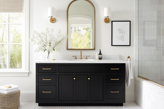 white cabinet with black hardware and green plants a classic and elegant design for a modern home