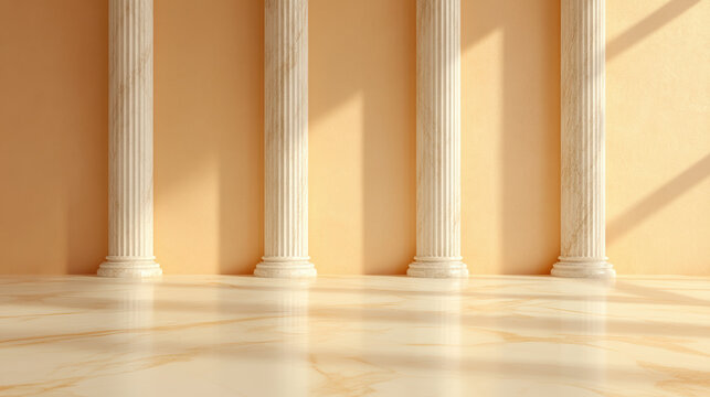 Elegant sunlit marble columns in a classical architectural hall illuminated by warm natural light