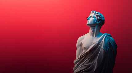 A marble statue stands against a solid red backdrop, the figure gazes upward, creating an image of aspiration and reverence. The color adds vibrancy to the classical piece.
