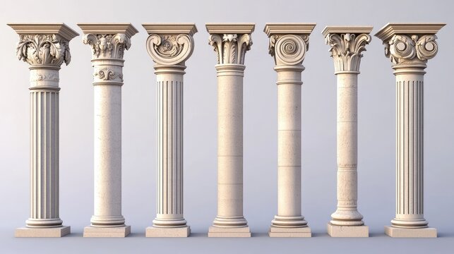 An abstract composition featuring geometric shapes, including cubes and spheres, arranged in a classical interior with pillars and windows, bathed in soft sunli