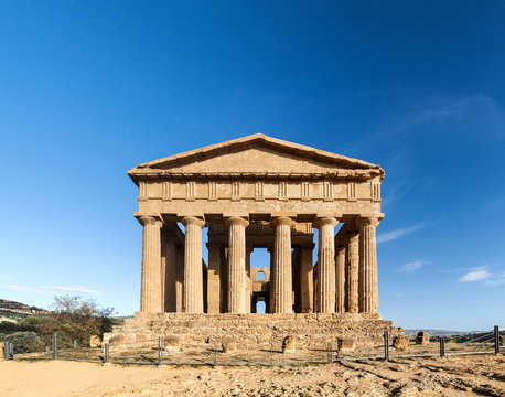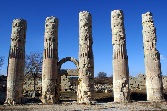 Ancient temple ruins with columns under a clear blue sky on a sunny day with trees around it