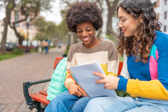 Chatting student typing on laptop on porch with classmate raising hand, health icons, copy space