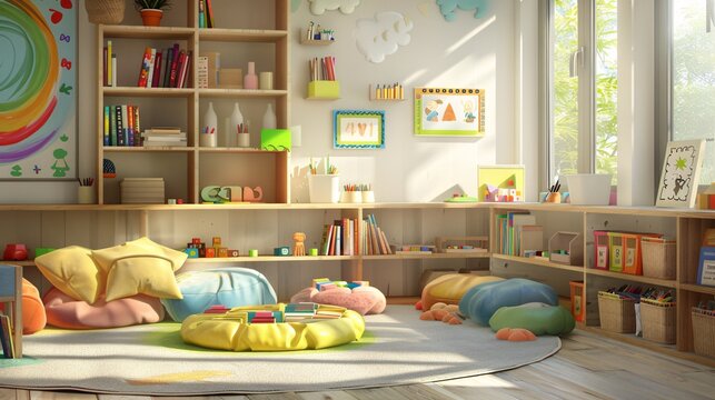 Cozy preschool classroom featuring a reading corner with soft cushions and a variety of books, art supplies on low shelves, and children's artwork displayed on the walls