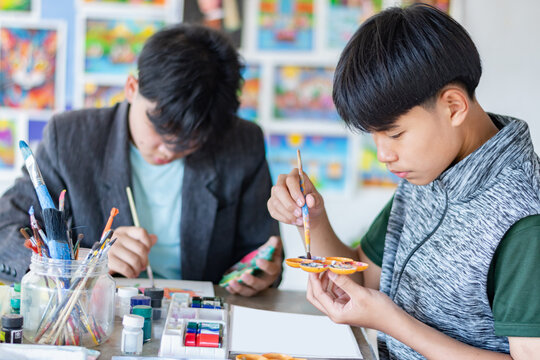 Learning to use poster color to draw various pictures of asian boys on a table outside classroom with his female art teacher, raising teen and adult helps kids school project concept.