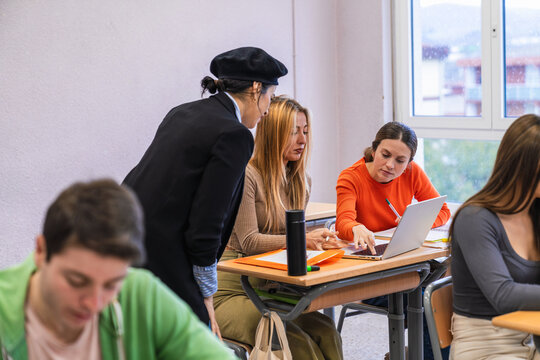 Group of diverse classmates engaged in a collaborative learning discussion around a table in a modern classroom setting