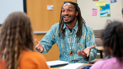 Cheerful educator engaging with a diverse group of students in a classroom setting, fostering a positive and collaborative learning environment with smiles and open discussions.