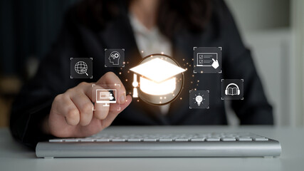 Artificial intelligence and digital education concept with business person using laptop and virtual interface, showing AI learning, smart education, online training, innovation, and future technology.