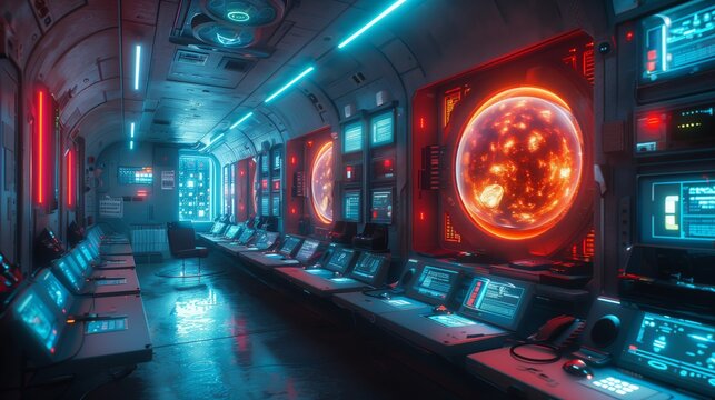 A futuristic classroom with robot teachers and a view of a star through a large window.