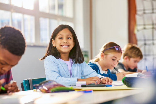 Smiling middle eastern schoolgirl smiling in primary classroom