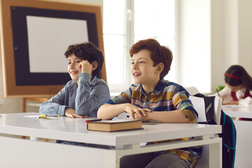 Pupils studying at desks in classroom. Portrait of two elementary school boys sitting in class and listening to the teacher. Concept of interesting school lessons for children.