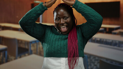 Woman gesturing playfully in a classroom setting with hands on head and vibrant pink braids under green sweater, expressing excitement or fun indoors.