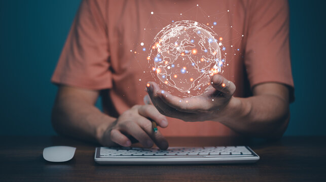 Leaning Online concept, Man Hand using computer and holding Global world internet telecommunication network connected around planet Earth and worldwide communication technology.