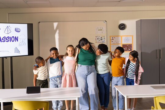 African American teacher with children posing and linking arms in classroom near PASSION display