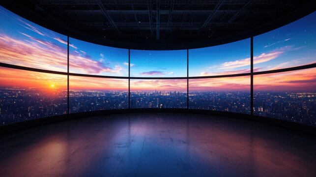 Vibrant sunset view from a led wall classroom urban landscape digital environment modern concept