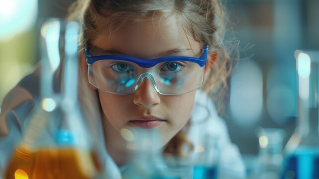Child scientist in lab coat doing chemistry experiment in classroom with blackboard full of science and math formulas, education and STEM learning for future innovation and discovery