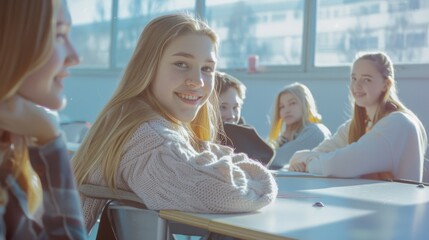 Schoolgirls whispering in classroom promoting friendship and secrets