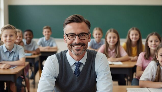 Smiling male teacher in classroom