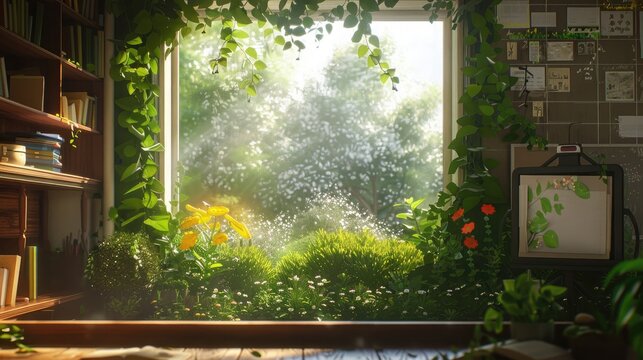 A classroom window framing a serene garden scene, offering a moment of tranquility amidst the bustle of learning.