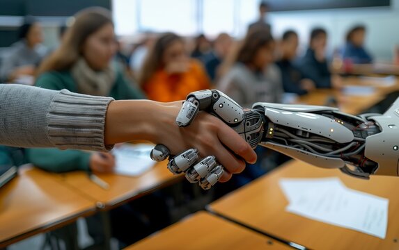 A human and AI robot handshake in a futuristic classroom representing the integration of technology in education with students in the background