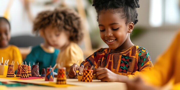 Diverse group of happy schoolchildren in classroom celebrating teamwork