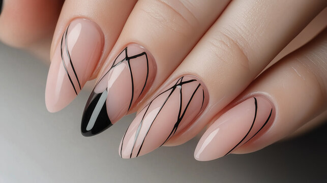 A set of nude almond-shaped nails featuring elegant black geometric line art for a modern and minimalist look.