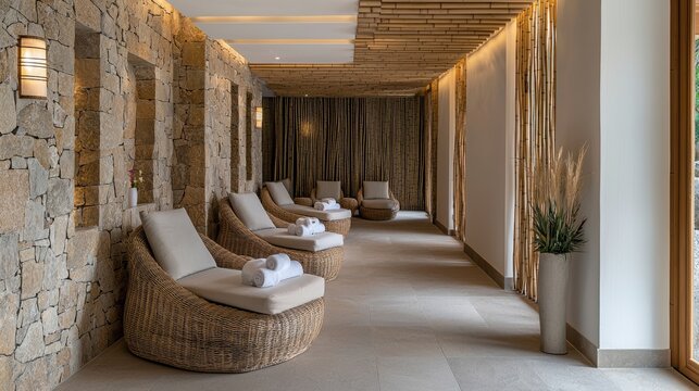Relaxing spa interior featuring comfortable loungers, soft lighting, and natural stone walls for a tranquil atmosphere.