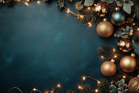 Glowing evergreen garland shimmering with warm string lights and golden bokeh