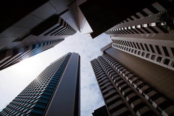 Skyscrapers tunnel of tall office towers surrounding the claustrophobic diminishing perspective view in downtown business district. Buildings are clad in glass with many rows of windows on the facade.