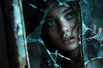 A woman's haunting gaze peers through shattered glass, evoking an intense sense of entrapment and despair in a dimly lit, claustrophobic setting.