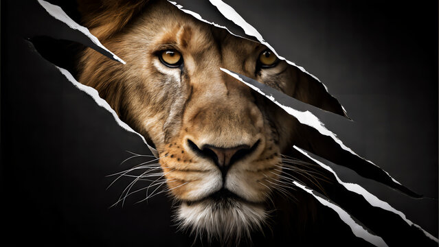 Wild Emergence: Lion Appearing Through Claw Tears.