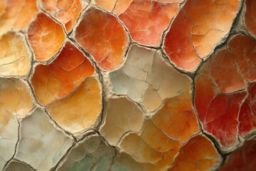 Close-up of a cracked and weathered surface, revealing a mosaic of warm orange and beige tones.