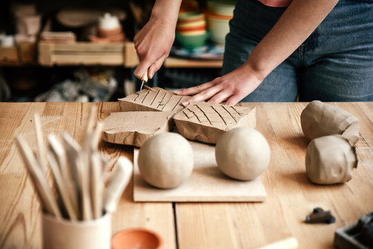 A potter makes marks on a piece of clay with a knife to soften it. Preparing for clay modeling in the workshop, close-up