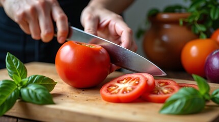 Hands slice a ripe tomato on a wooden board fresh basil, veggies, and a clay pot in the background (cozy kitchen scene).