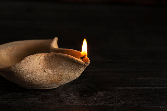A Lit Handmade Oil Lamp from the Middle East on a Dark Table