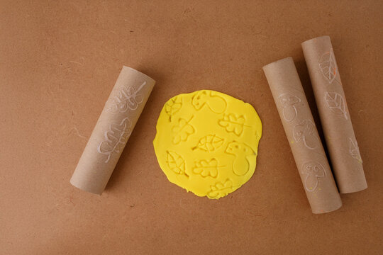 innovative clay stamping technique using cardboard tubes with leaf and mushroom patterns, great for craft brands, educational content, sustainable diy projects, children creativity workshops,
