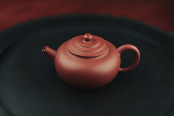clay teapot for the tea ceremony. there are 2 ceramic tea files on the stand