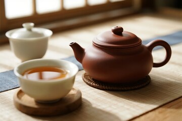 Traditional tea set with clay teapot and ceramic cups on a bamboo mat, illuminated by natural light