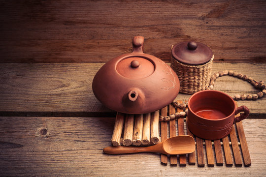 Four clay cups and teapot of traditional eastern tea