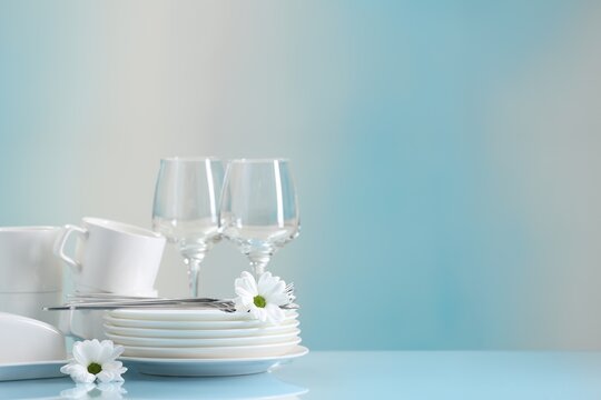 Set of many clean dishware, cutlery, flowers and glasses on light blue table. Space for text