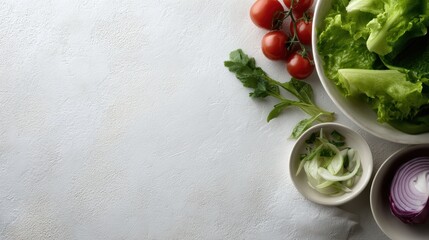 Healthy vegetarian clean eating layout, salad ingredients frame on white table, top view banner style