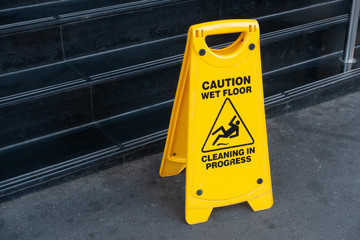 A worker mops the shiny floor of a modern office building using a yellow mop. A caution sign indicates wet floors, ensuring safety for visitors. The area is bright and clean.