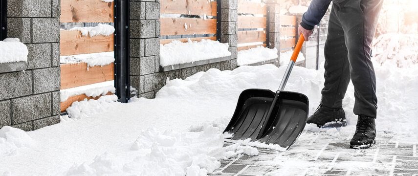 Business woman with shovel cleaning snow filled street in front of the office at work