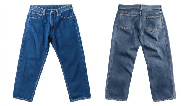 Men’s jeans front and back views, photographed flat with belt loops and stitching visible, on clean white