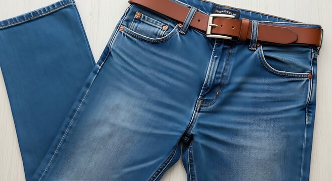 Stylish denim jeans paired with a brown leather belt on a clean white surface