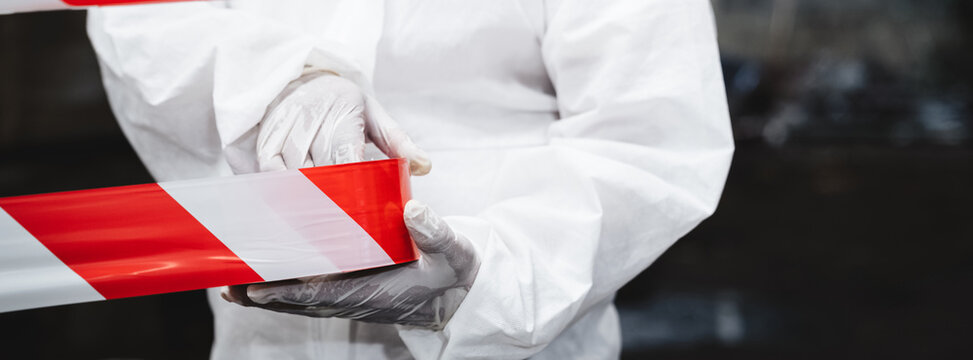 Close up hand of workers wear protection suit checking chemical contaminated oil in old factory. Red and White Lines Marking a Dangerous Zone. Biohazard Contamination Control.