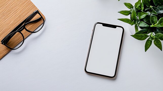 A clean white desk is neatly arranged with a phone, glasses, and a green plant for a touch of nature.