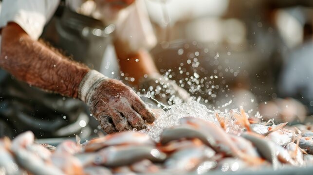 Hands busy cleaning and preparing fresh fish at a bustling seafood market, portraying the diligent effort and meticulous attention required in the process.